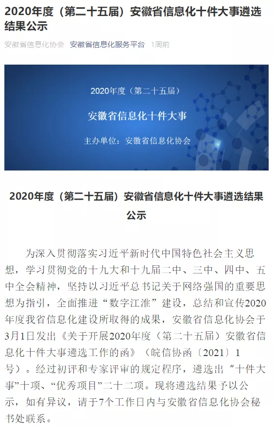近日,安徽省信息化协会公示了2020年度(第二十五届)安徽省信息化十件大事遴选结果,bbin宝盈信息申报的“芜湖市信息资源安全治理项目”经过初评和专家评审,成功入选2020年度安徽省信息化十件大事,标志着我公司信息化建设再上新台阶。