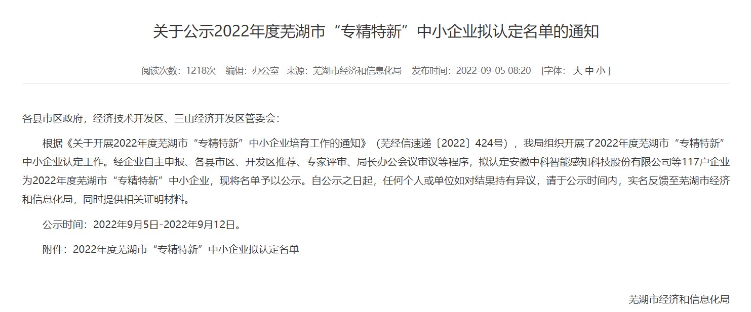 9月5日,芜湖市经信局公布了 2022年度芜湖市“专精特新”中小企业认定名单,经过7天的公示期,安徽bbin宝盈信息技术有限公司等117家企业被认定为2022年度芜湖市“专精特新”中小企业。