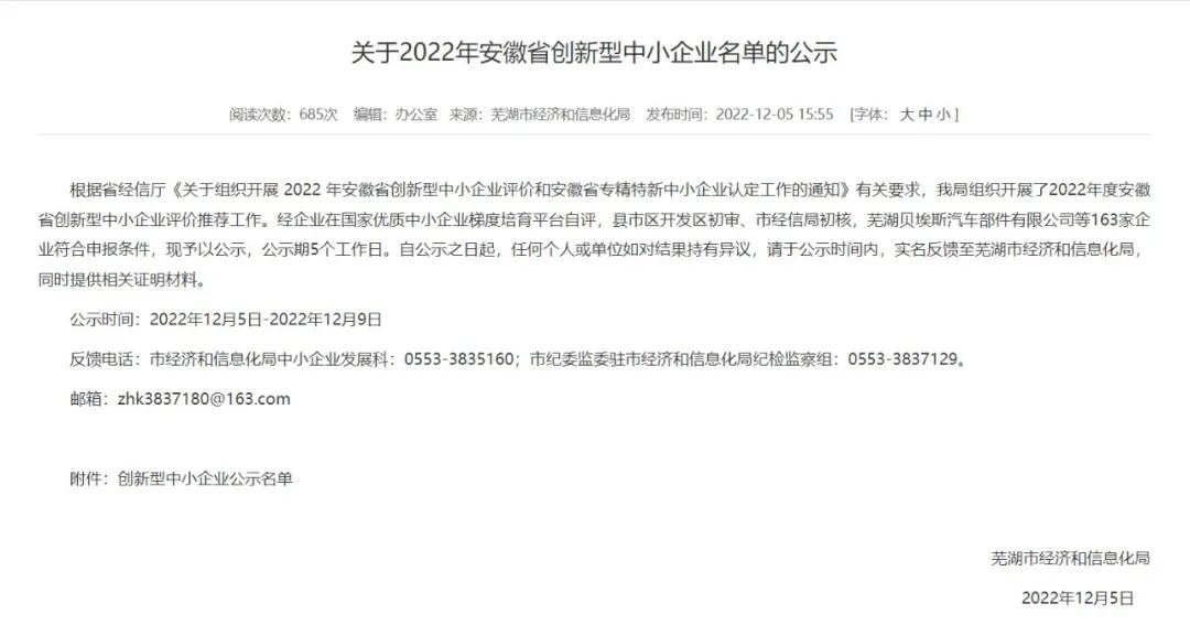12月5日,芜湖市经信局公布了2022年安徽省创新型中小企业名单。安徽bbin宝盈成功通过审核,被认定为安徽省创新型中小企业!