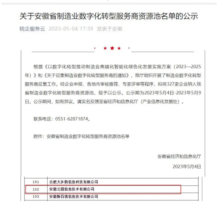 ? ? ? ?2023年5月4日,安徽省经济和信息化厅公布了安徽省制造业数字化转型服务商资源池名单,经过一周的公示期,安徽bbin宝盈成功入选。欢迎有需求的企事业单位或同行业人士前来交流指导!